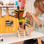 Cet hôpital sur pilotis offre une grande richesse de jeu grâce à ses multiples zones d’action : plateforme d’atterrissage avec hélicoptère pour les urgences, table d’auscultation pour les soins, enclos sécurisé pour l’accueil des animaux, pont de singe suspendu menant à un grand baobab, et échelle pour accéder aux différents niveaux. Un décor intelligemment conçu pour encourager les histoires d’exploration et de sauvetage.