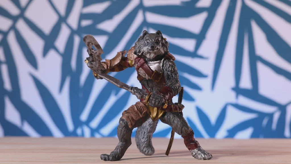 Bewaffnet mit einem sehr großen Schwert, einem Säbel und einem Entermesser ist er bereit, sein Territorium gegen alle Kreaturen der Fantasiewelt zu verteidigen. Überraschenderweise waren Hybridwölfe in einigen Legenden die Wächter verzauberter Wälder und Beschützer vergessener Königreiche.